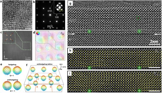 图1.反铁电PbZrO3超薄膜中一维拓扑缺陷-位错与极化拓扑结构强相互作用。(a) TEM平面样形貌图显示周期性晶格衬度。(b) 平面电子衍射花样。(c)平面样的原子图像。(d)对应的极化矢量图。(e) “刺猬畴”和“反刺猬畴”结构。(f) 三维“反刺猬畴”四方晶格。(g) 超薄膜截面全元素原子像。(h),(i) Pb原子、Pb-O原子极化位移矢量图。