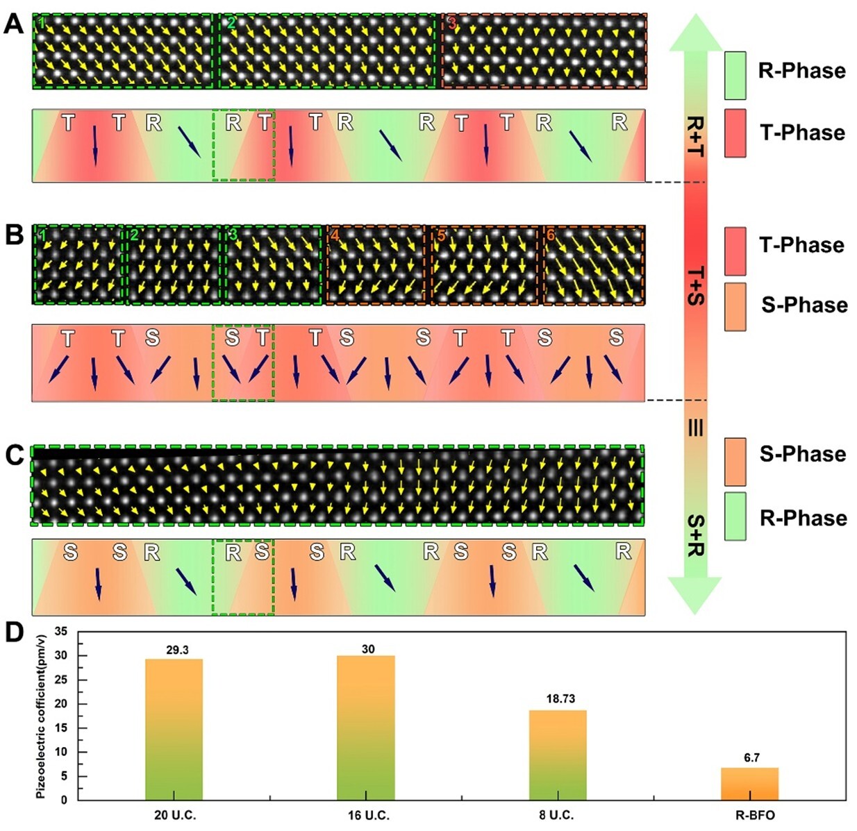 研究团队利用精密脉冲激光沉积技术在LaAlO3衬底上高质量外延生长了(BiFeO3/Ca0.96Ce0.04MnO3)4多层异质结。他们通过像差校正透射电子显微镜,结合原子尺度极化分析和定量压电测量技术(IDS-PFM),发现该多层膜中BiFeO3层的晶格和极化参数随厚度演变规律显著区别于单层BiFeO3薄膜。尤其是当单层BiFeO3厚度为16个单胞层时,出现了一种低对称性S相,其内部极化矢量发生了明显的旋转,结合IDS-PFM技术发现其压电系数达到传统R相BiFeO3的四倍以上。相场理论模拟表明,在实验中观测到的过渡相与高密度纳米畴的协同效应增强了上述压电性能。他们还系统揭示了从20个单胞层到8个单胞层厚度范围内,体系依次呈现出周期性R/T混合相-T/S混合相-S/R混合相的完整演化规律,从而确定了新发现的过渡相在优化超薄BiFeO3薄膜压电性能中起到的关键作用。