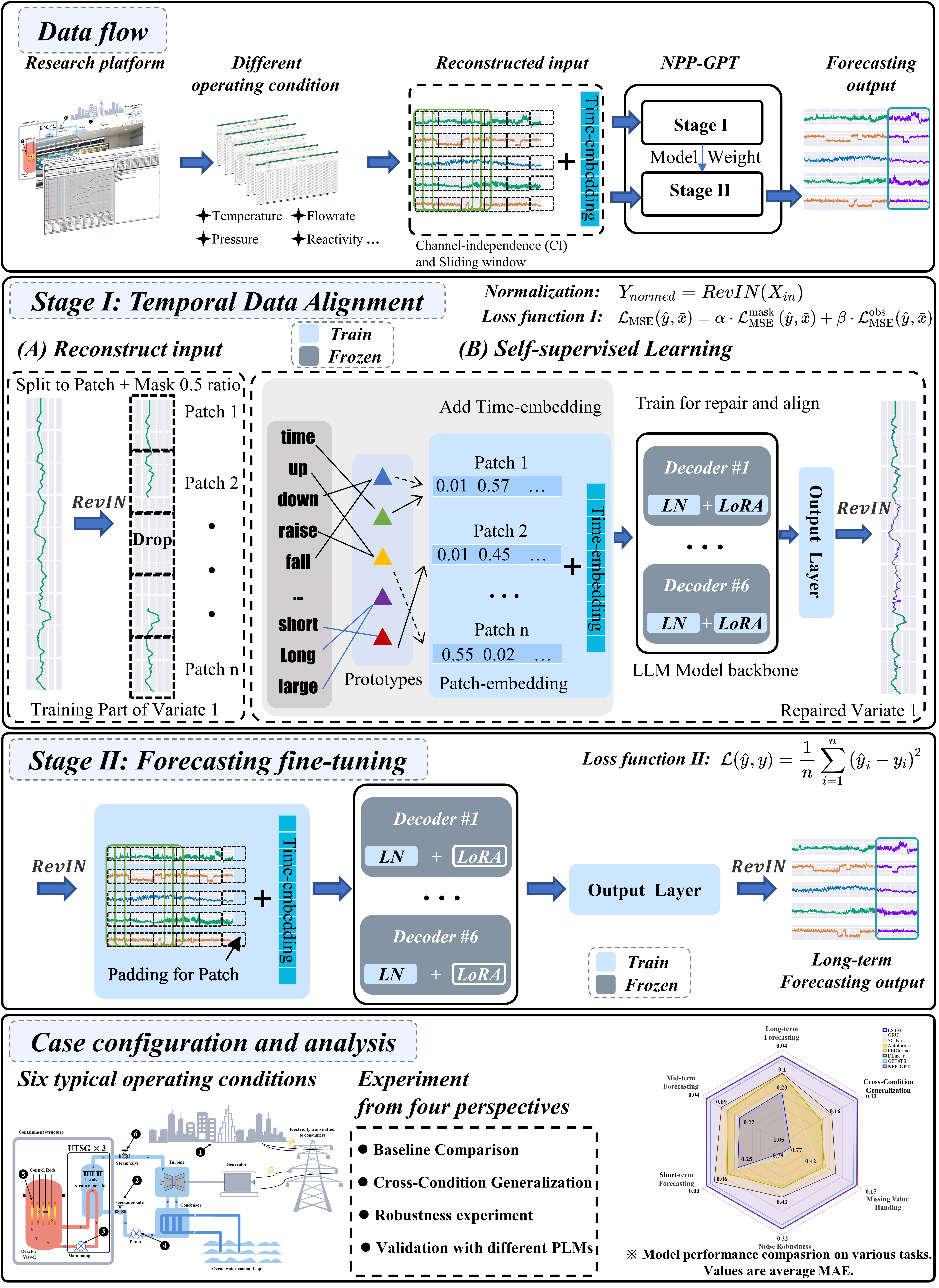 针对上述难题,研究团队提出了NPP-GPT框架,首次在无需显式提示词(prompt)工程的情况下,探索将预训练大语言模型应用于核电站运行参数预测。该框架创新采用两阶段跨模态迁移学习策略:第一阶段通过输入嵌入重构与基于随机遮蔽的自监督“重构式”学习,实现数值时序与预训练语言模型表征空间的有效对齐;第二阶段采用LoRA参数高效微调,将领域知识注入GPT-2自注意力模块的Q/V投影,在保持预训练通用能力的同时,显著提升对核电运行数据的预测性能,并兼顾训练与部署效率。