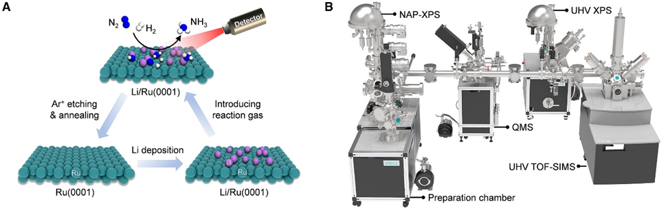 苏州纳米所研究团队依托纳米真空互联实验站(Nano-X),在超高真空互联系统中对Li/Ru模型催化剂开展了精准构筑与原位表征,团队将金属锂原子沉积在金属钌单晶表面,构建了具有高活性金属Li/Ru界面的新型催化剂,并验证了常温常压下热催化N₂与H₂高效合成氨的可行性,从原子尺度揭示了Li-Ru协同活化N₂的关键机制。其中面临着一个极大的实验挑战:金属锂对空气(氧气和水)极度敏感,极易被氧化,传统的非原位表征手段根本无法获取真实的催化活性中心和反应中间体信息。为解决这一难题,研究团队充分依托Nano-X的独特优势;研究人员首先在分子束外延(MBE)腔室中,在Ru(0001)单晶表面精准沉积Li金属,构建了理想的Li/Ru模型催化剂;随后,在不破坏真空、全程隔绝大气的条件下,将样品转移至反应腔室通入N₂和H₂进行常温反应;最后,继续通过真空互联管道将反应后的样品分别转移至X射线光电子能谱(XPS)、飞行时间二次离子质谱(TOF-SIMS)以及四极杆质谱(QMS)等表征节点,实现了对表面物种的准原位(quasi-in situ)精准探测。得益于Nano-X的多模态模型催化研究平台,团队首次清晰地捕捉到了Li-NHx(如[LiN]-、[LiNH]+等)关键反应中间体,并实时监测到了室温下NH3的生成,这一实验证据为Li/Ru界面的常温催化机制提供了最直接、最坚实的支撑。