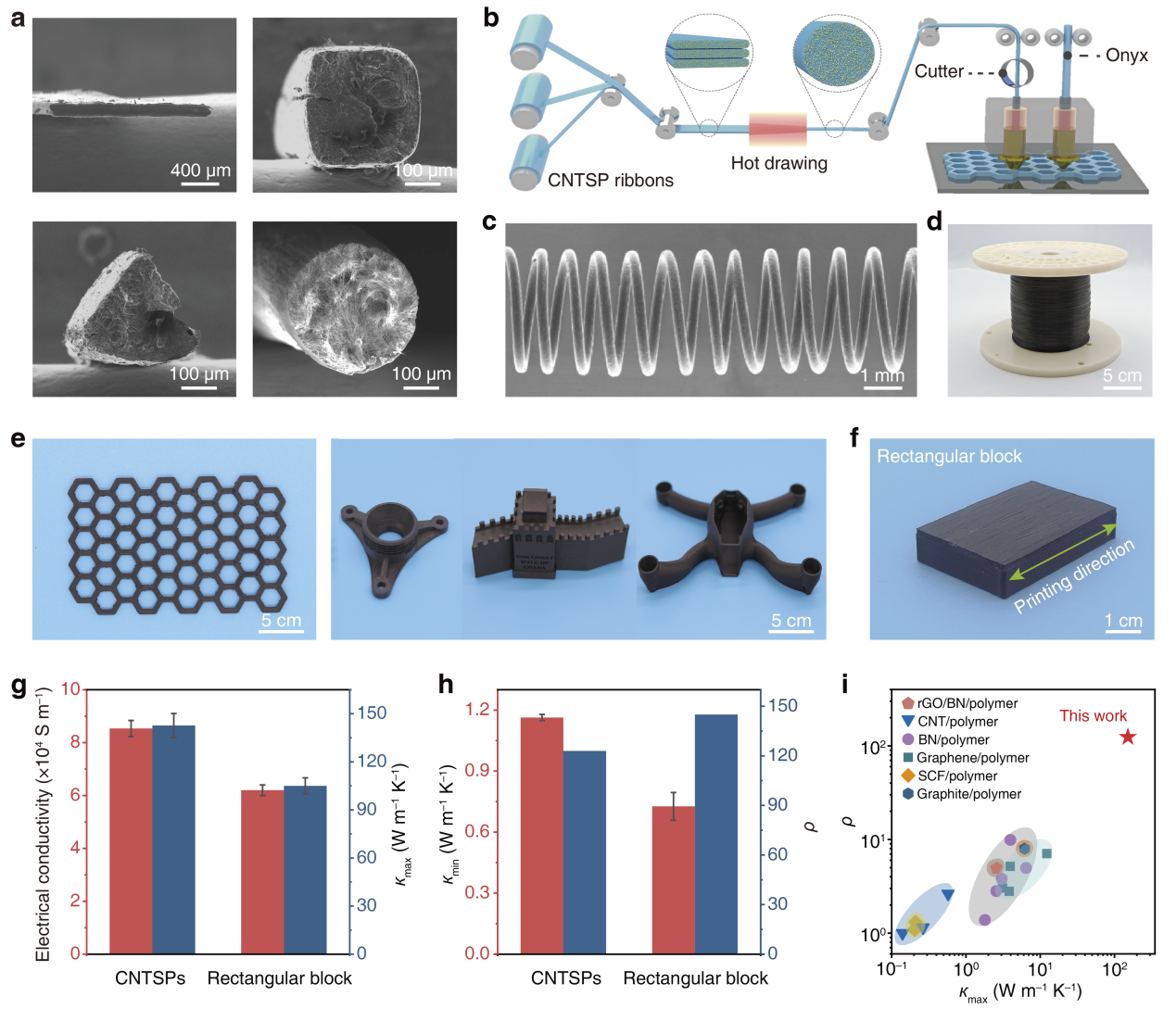 针对上述问题,中国科学院苏州纳米所张永毅研究员及合作者开发出一种可规模化制备的原位碳纳米管-聚合物融合与热加工工艺,成功制备出兼具超高性能与优异加工性的碳纳米管超级塑料(CNTSP),该材料实现了定向高热导、高强高导的特性,且可通过3D打印、热压成型制备成各类结构,为电子器件高效热管理提供了全新解决方案。