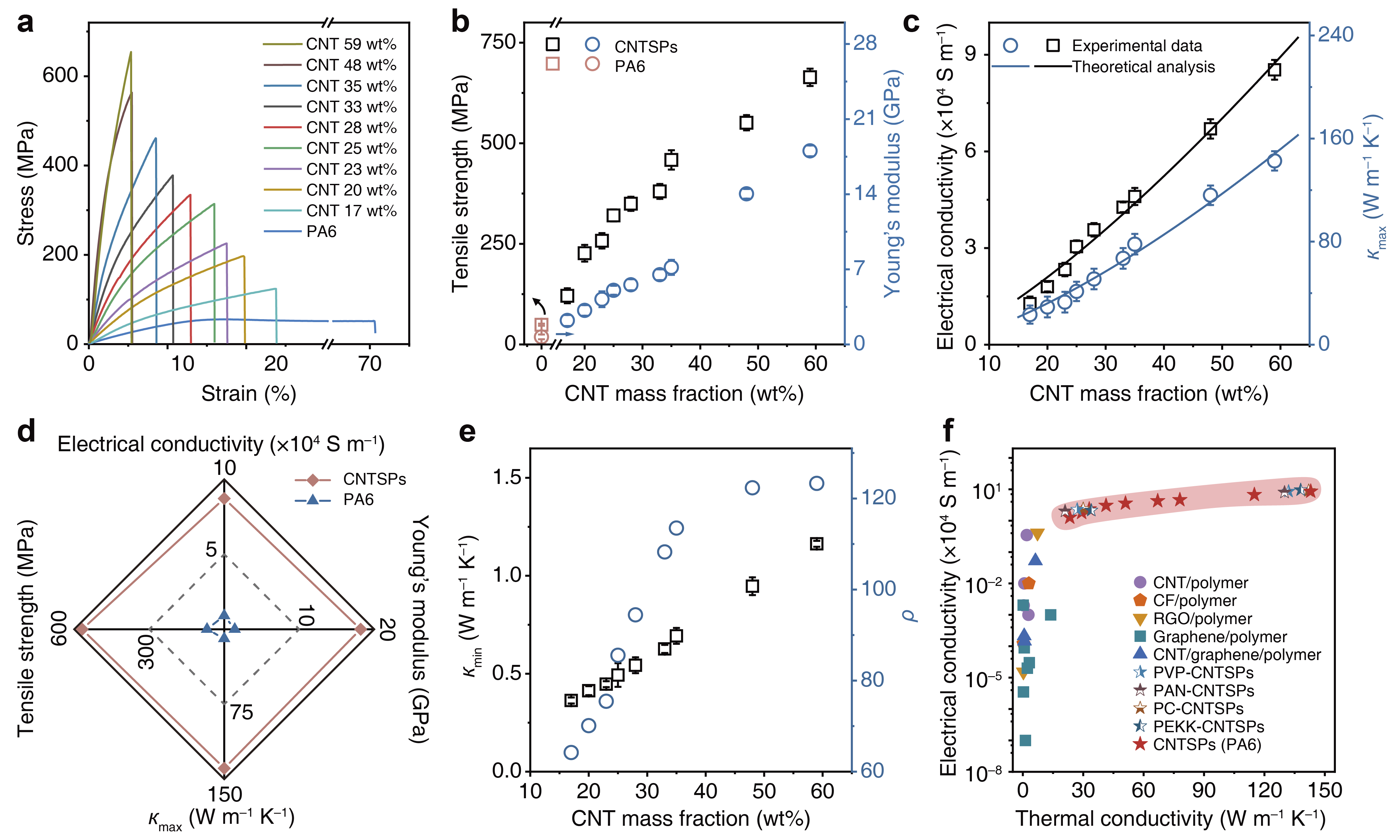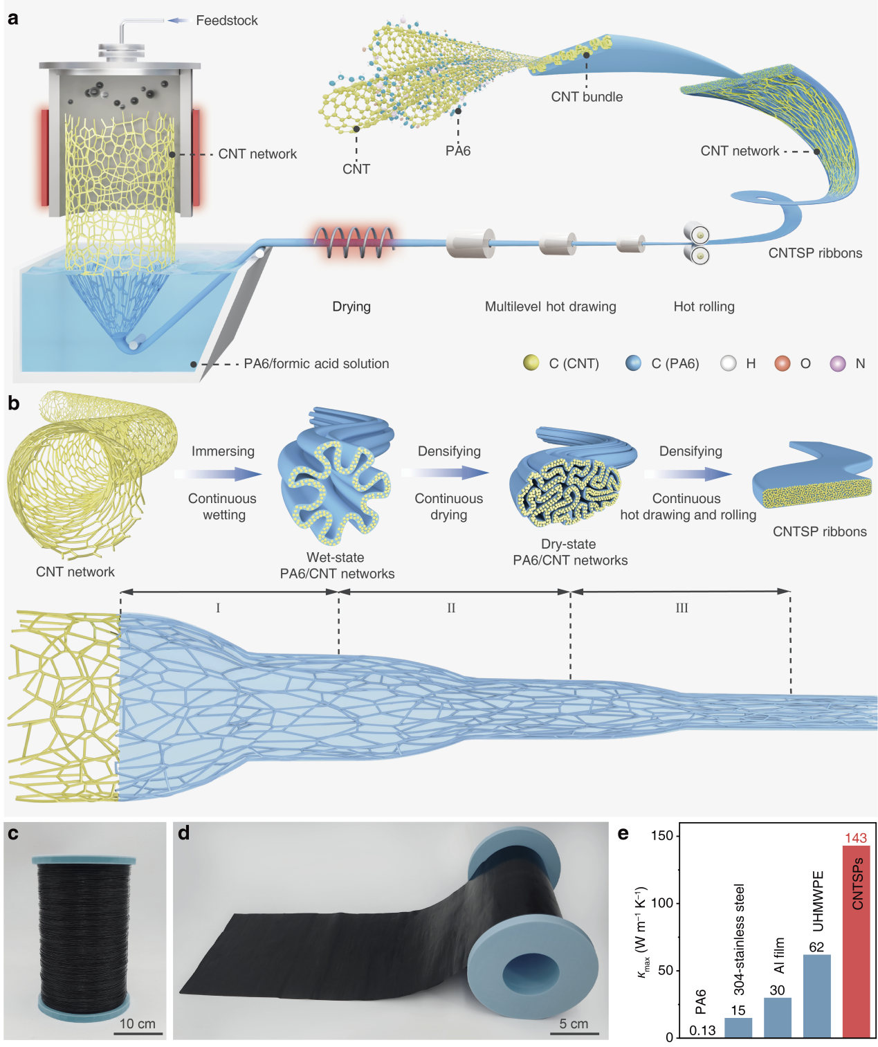 研究团队采用浮动催化剂化学气相沉积法制备的长碳纳米管网络(碳纳米管长度约100 μm)为基础,将其浸入聚酰胺6(PA6)/甲酸溶液中,实现了高达59 wt%的碳纳米管负载。该过程既保留了碳纳米管原有的高长径比,又促使其与聚合物分子发生自发融合,有效提升了碳纳米管的取向度与堆积密度。这种特殊的微观结构赋予了碳纳米管超级塑料卓越的热学性能:其热导率可达143±5.8 Wm–1K–1,且呈现出高度定向的传热特性,热导率各向异性比约为123。同时,该材料还兼具优异的力学与电学性能,机械强度达663±18 MPa,电导率为8.6×104 Sm–1。