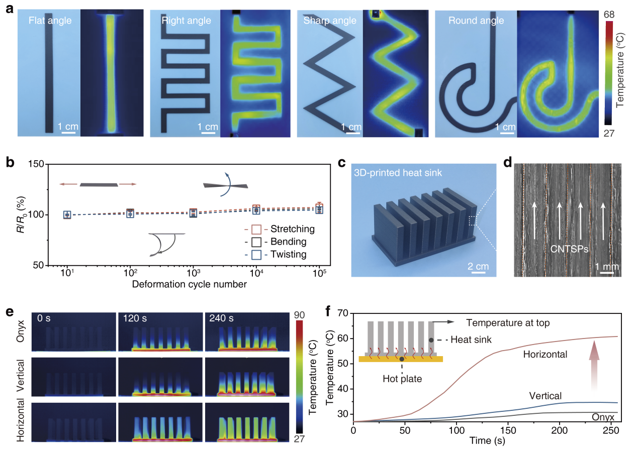 此外,团队通过一系列实验验证了CNTSP在热管理领域的优异应用潜力:将CNTSP打印件作为散热器,当碳纳米管取向方向与热流方向平行时,CNTSP散热器的热传输效率显著提升,能快速将90℃热源的热量导出,而垂直取向时则有效抑制热损耗,实现了精准定向散热。更重要的是,该工艺具有良好的通用性,除PA6外,还可拓展至聚乙烯吡咯烷酮(PVP)、聚丙烯腈(PAN)、聚碳酸酯(PC)、聚醚酮酮(PEKK)等多种工程塑料,制备的系列CNTSPs材料的热、电性能均较纯聚合物提升两个数量级以上,且保持优异的加工性,不仅满足了航空航天、新能源等不同领域的高性能材料需求,也开拓了高性能聚合物基复合材料研发新方向。
