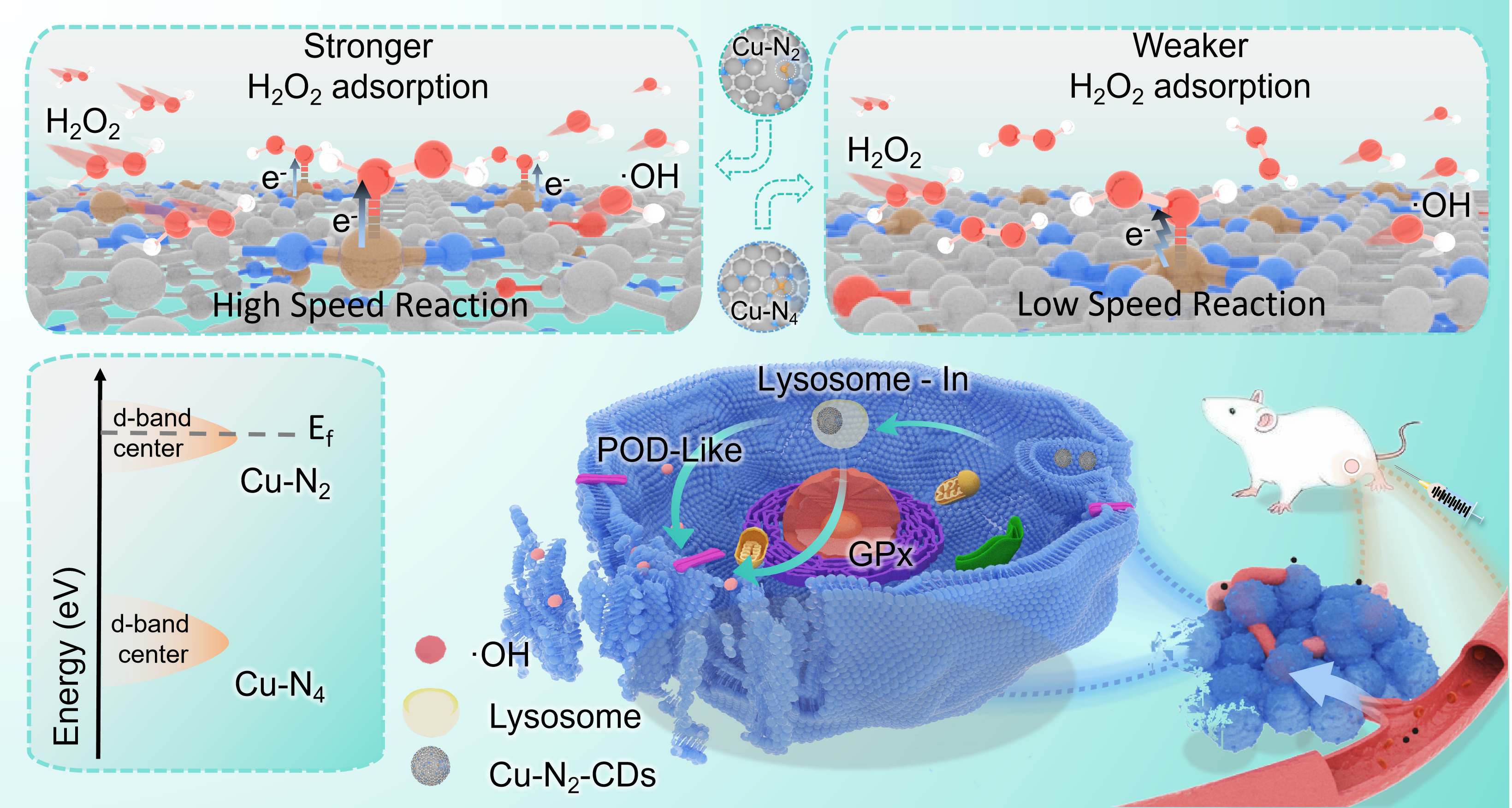 结合多维度表征与理论计算,团队阐明了催化增强的核心机制:Cu-N2不饱和配位赋予金属中心高自旋富电子特性,使H2O2吸附能力提升3.49倍,·OH生成反应速率达Cu-N4-CDs的 3.62 倍,揭示了单原子纳米酶的构效关系,为高性能纳米酶设计提供了全新范式。