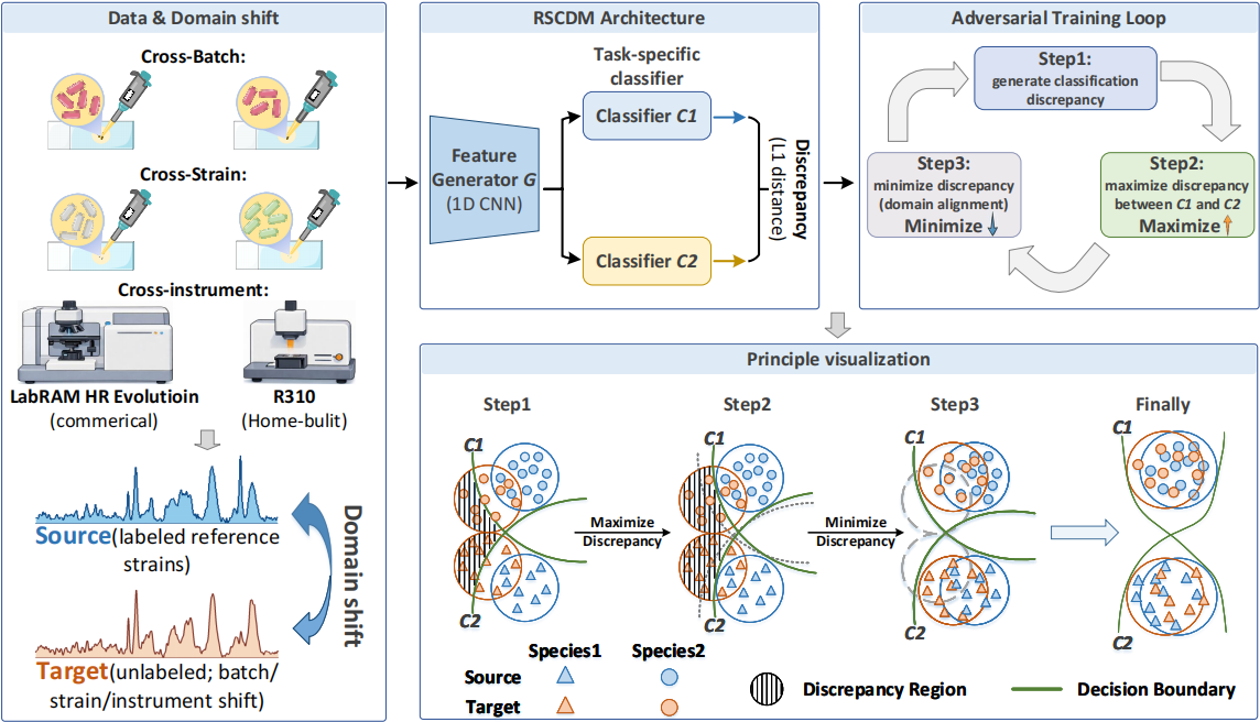 针对这一共性难问题,中国科学院苏州生物医学工程技术研究所宋一之研究团队提出了一种面向拉曼光谱跨域迁移的拉曼光谱分类差异模型(Raman Spectral Classification Discrepancy Model, RSCDM)。该方法基于无监督领域自适应思想,构建了“特征提取器+双分类器”协同框架,通过主动放大并逐步缩小两个分类器对目标域样本的预测差异,动态识别偏离源域分布的样本,并引导模型完成面向任务决策边界的特征对齐,从而有效缓解跨批次、跨样本和跨仪器引起的光谱差异问题。在基于拉曼光谱的病原菌种鉴定任务中,显著提升了模型在复杂多菌种分类场景下的识别稳定性、准确性和泛化能力。该研究的核心优势主要体现在以下几个方面: