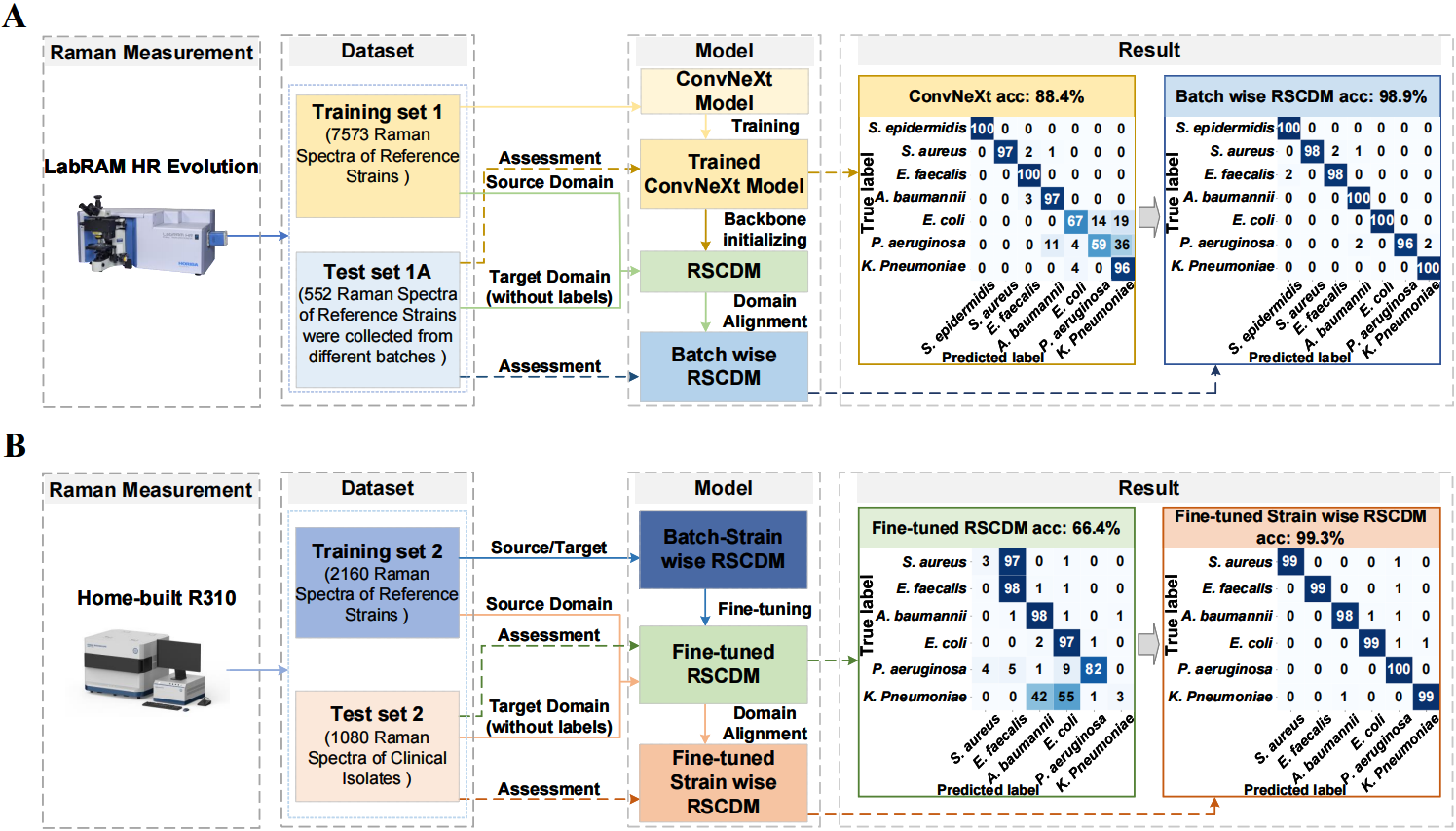 3. 显著提升模型泛化能力和识别准确率:在商用拉曼平台上,针对跨批次、跨菌株的7种细菌分类任务,模型准确率由81.6%提升至95.4%;在自研拉曼平台R310上,针对未纳入训练集的临床分离株,在结合跨仪器参考菌株微调后,临床分离株识别准确率可进一步提升至99.3%,显示出优异的跨仪器适应能力。