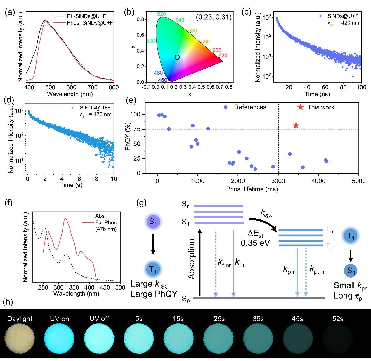 针对这一难题,中国科学院苏州生物医学工程技术研究所董文飞研究员团队创新性提出一种“高产率发光中心+双功能刚性基质”的协同构建策略,成功制备出一种基于硅纳米点(SiNDs)的高性能长寿命磷光材料。前期研究成果(Chem. Eng. J. 2023, 470, 144349.)表明SiNDs的高量子产率特性具备开发高性能磷光材料的潜力。在此基础上,研究团队针对磷光发射对“刚性微环境”的核心需求,对材料结构进行了优化设计。在本研究中,硅纳米点被固定于由熔融尿素和脲醛树脂组成的双功能复合基质之中。其中熔融尿素提供了有效的空间限域作用,而脲醛树脂则构建了丰富的氢键网络。二者协同作用有效抑制了发光基团的分子振动与非辐射跃迁过程,由此制备的室温磷光材料(SiNDs@U+F)表现出优异的综合性能。