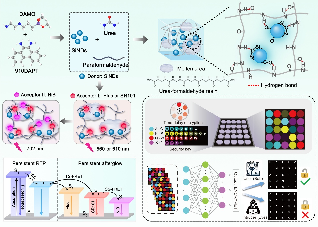 图1.硅纳米点复合物材料的合成和发光过程示意图,以及人工智能辅助的动态信息加密过程