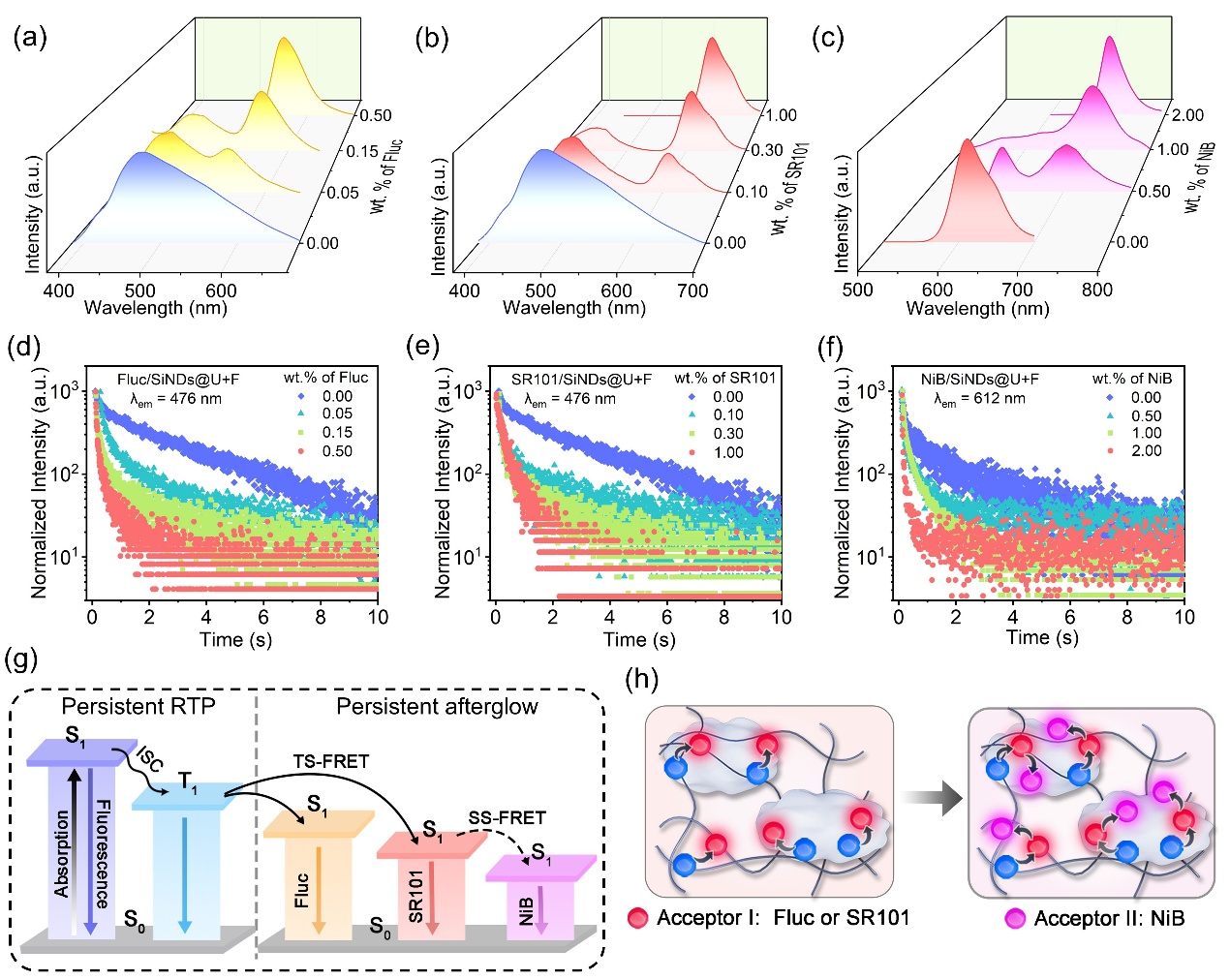 图3.不同染料掺杂下的硅纳米复合物材料的光致发光性质,以及磷光共振能量转移示意图