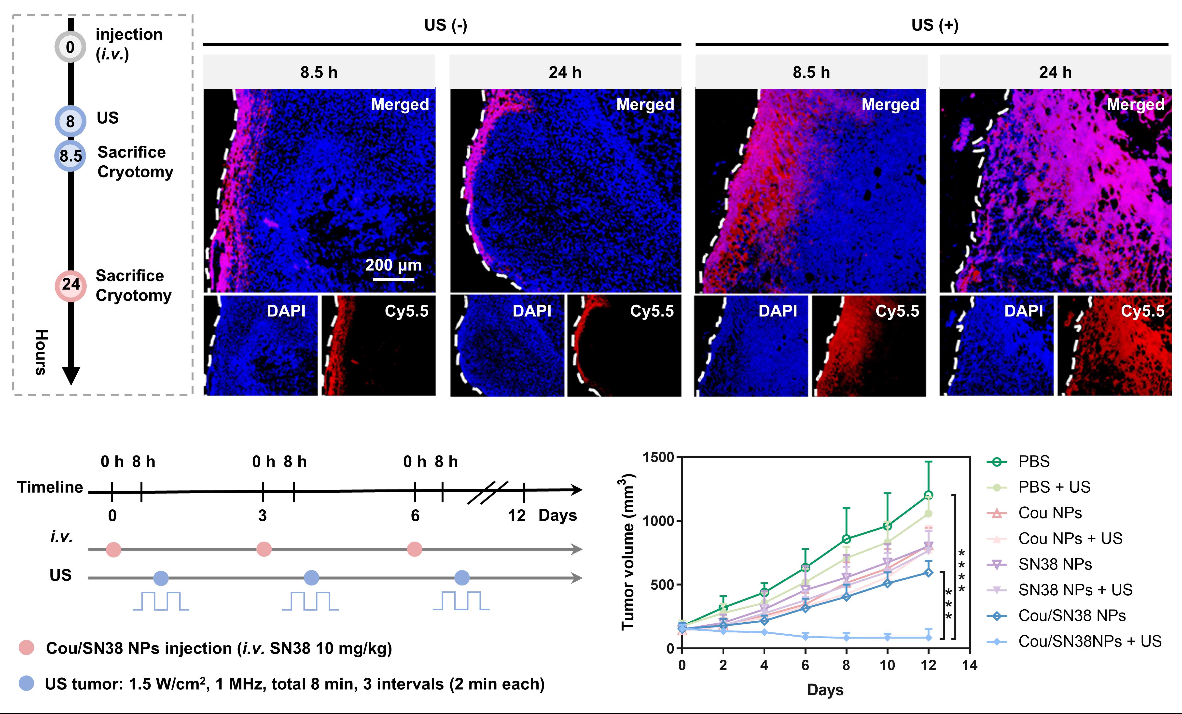 图4. 超声触发电荷反转纳米颗粒Cou/SN38 NPs在实体瘤中的深层渗透和显著抑瘤效果