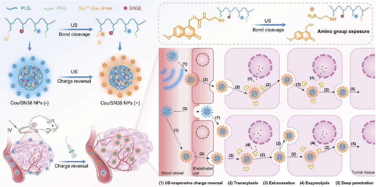 中国科学院长春应用化学研究所在利用超声触发纳米药物电荷反转以增强实体瘤深层渗透的研究中取得重要进展。研究团队首次揭示了香豆素衍生的氨基甲酸酯键的超声响应裂解机制,并创新性地将该结构用于构建可超声遥控的电荷反转纳米递送系统。该系统在低强度超声作用下发生快速电荷翻转,激活高尔基体依赖性迭代转胞吞通路,最终实现了纳米药物在实体瘤中的深度穿透与高效低毒治疗(图1)。相关研究成果以“Ultrasound-Triggered Charge-Reversal Nanoparticles via Golgi-Dependent Iterative Transcytosis for Enhanced Deep Tumor Penetration”为题,发表于《ACS Nano》。