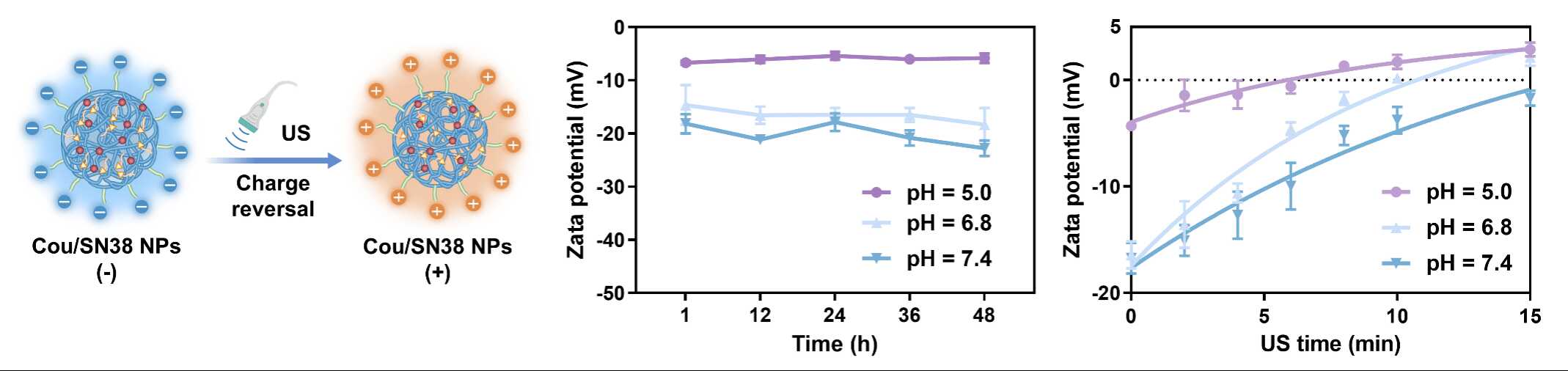 图3. 超声触发电荷反转纳米颗粒Cou/SN38 NPs的电荷精准调控