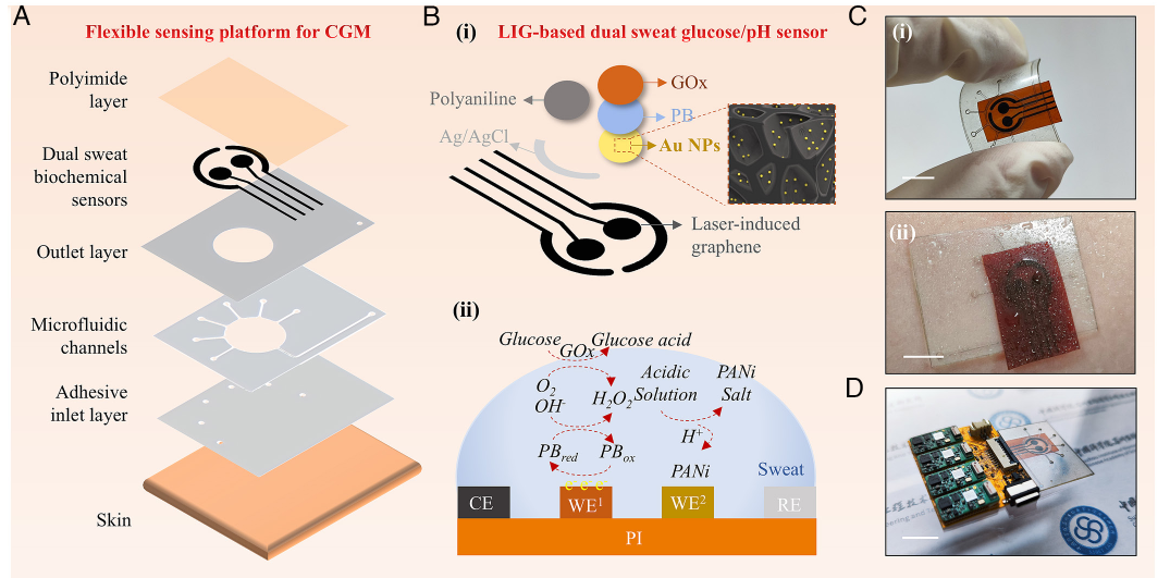 在器件方面,团队基于激光诱导石墨烯(LIG)构建多孔电极,并通过原位沉积金纳米颗粒提升电化学活性,集成葡萄糖与pH双传感单元、微流控汗液采集结构及无线数据模块,形成可贴附皮肤的柔性监测系统(图1)。