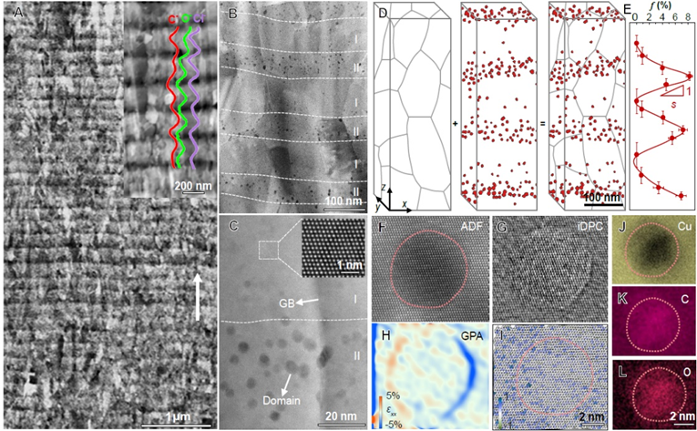 优异性能的协同提升源于纳米畴在“晶粒间和晶粒内”的双重序构效应。水平方向上,晶粒间均匀分布的纳米畴能有效抑制应变局域化,提升材料的整体均匀变形能力;垂直方向上,梯度分布的纳米畴则诱导产生超高密度的几何必需位错,实现显著强化。尤其是,超高密度、极小尺寸的纳米畴与基体呈半共格界面,既能有效钉扎晶界,抑制晶粒长大,又因其对电子的散射作用极弱,确保铜箔的高导电性。